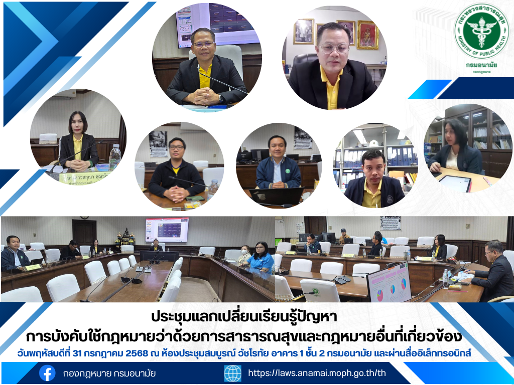 วันที่ 31 กรกฎาคม 2568 กองกฎหมาย กรมอนามัย จัดการประชุมแลกเปลี่ยนเรียนรู้ปัญหาการบังคับใช้กฎหมายว่าด้วยการสาธารณสุขและกฎหมายอื่นที่เกี่ยวข้อง
