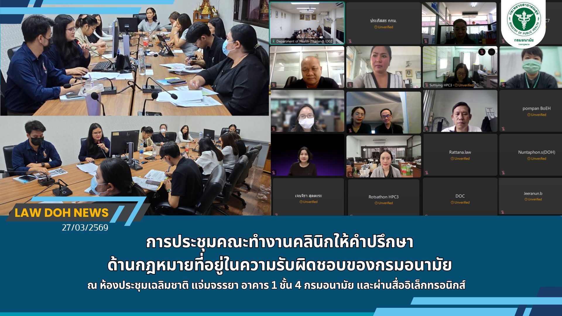 จัดประชุมคณะทำงานคลินิกกฎหมายที่อยู่ในความรับผิดชอบของกรมอนามัย เวลา 09.00 – 12.00 น. ณ ห้องประชุมเฉลิมชาติ แจ่มจรรยา กองกฎหมาย อาคาร 1 ชั้น 4 กรมอนามัย และผ่านสื่ออิเล็กทรอนิกส์ โดยมีประเด็นการประชุม ดังนี้